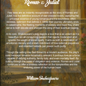 Their intense and impulsive romance unfolds with beauty and heartbreak, leading to one of the most unforgettable endings in literary history. Shakespeare’s poetic language and emotional depth make this play a masterpiece that continues to captivate readers across generations.